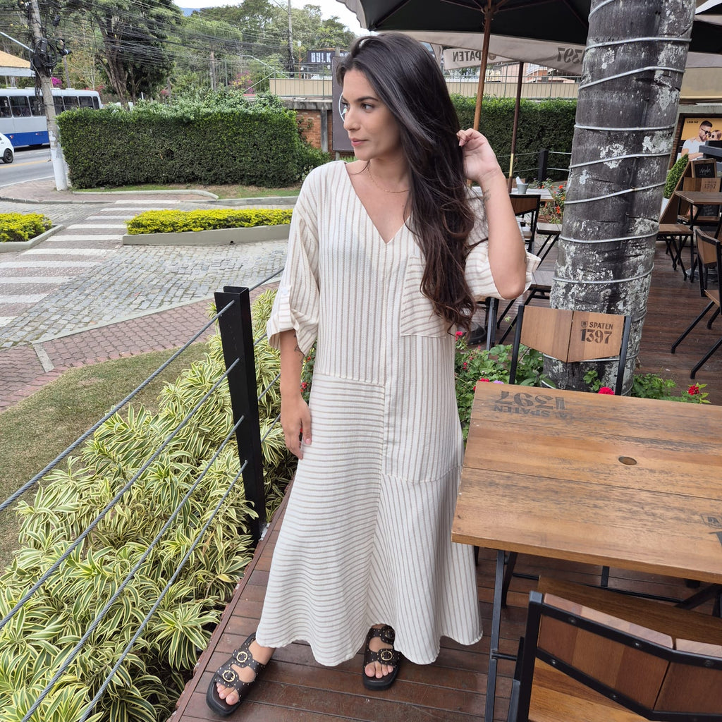 Inspirado na leveza da elegância natural, o Vestido Serena di Firenze combina o charme atemporal do linho com uma silhueta fluida e contemporânea. Com design minimalista e padronagem sutil, ele valoriza o corpo com conforto e sofisticação. O decote em V e as mangas dobradas trazem um toque despojado na medida certa, ideal para composições versáteis — da rotina elegante ao encontro especial.